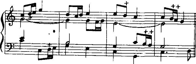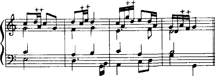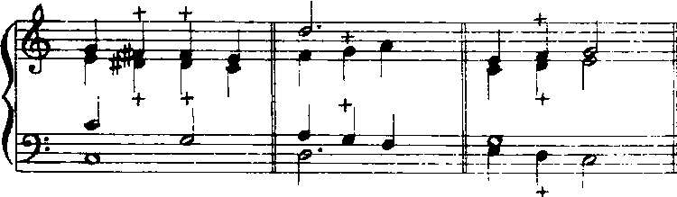 多重和弦外音是同一时间内在两个以上声部中出现的重叠的和弦外音。如例中 “+”所示: