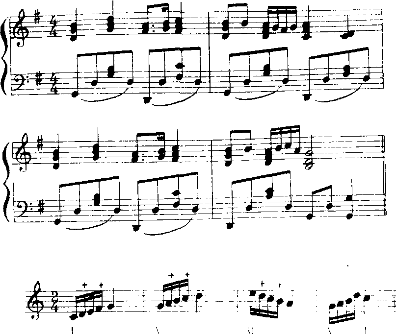 和弦外音Hexian waiyin在多声部音乐中,不属于和弦中的音而又与和弦同时发响。和弦外音在增强和声的色彩与紧张程度变化上起着重要作用。和弦外音按其声部多少可分为单声部和弦外音和多重和弦外音。单声部和弦外音是同一时间内只在一个声部中出现的单个和弦外音。如例中 “+”所示: