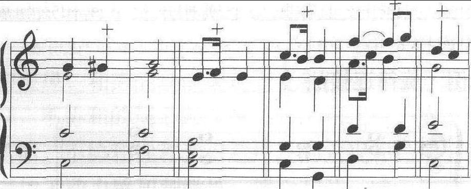 先现音是后面和弦的和弦音在前一和弦的同一声部先期出现的和弦外音。如例中“+”所示: