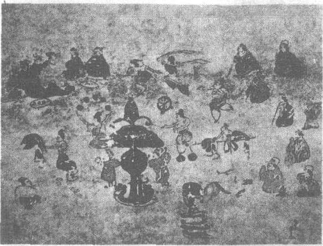 和林格尔汉墓壁画 (局部) 和林格尔汉墓壁画位于新店子小板申村东,西北距县城40公里。墓主为东汉末年管理北方乌桓、鲜卑、羌等少数民族事务的护乌桓校尉。墓表封土约高2米,墓室为穹庐顶多室砖墓,全长约20米。墓道、墓门、甬道、前室、中室、后室及三个耳室,共占地百余平方米,绘有50多组彩绘壁画,是自治区内迄今所见图幅与榜题最多的汉代壁画。皇帝褒奖、庆功筵宴、车马出行、城垣官衙、坞堡庄园等壁画场景,描绘出墓主一生的荣耀富贵,为汉代政治、经济、军事与文化等方面的研究,提供了宝贵资料。其面法,大量运用单线平涂法,兼用白描、没骨法。《牧马图》最见功力,六匹牧马、三匹马驹皆矫健神气,栩栩如生,连马鬃毛的飘逸感也跃然画面。 和林格尔汉墓壁画1971年我国文物考古工作者在内蒙古和林格尔县发现的一座汉墓壁画。墓建于东汉桓、灵之世(147—188年间),墓主人历任西河长史、繁阳令、使持节护乌桓校尉等职。壁画共46组,57幅,榜题二百五十项,面积100余平方米。分别绘于前、中、后墓室和三个耳室的墓壁和顶部。内容有封建官僚的政治活动(出行图、迎迓图),地主阶级的腐化生活(饮宴图、燕居图、乐舞图、百戏图等),劳动人民的生产活动(牧马、牧牛、牧羊、农耕、碓舂、厨炊等图),地主庄园、官僚府第、城市规模和历史故事等。布局合理,结构紧凑,内容丰富;采用平面、鸟瞰、透视、着色等多种技巧,富于立体感,为古典现实主义作品,显示出我国古代各族画工的智慧和艺术才能。是研究东汉政治、经济、文化、社会生活、文物制度、民族关系、建筑艺术、交通、水道等方面的珍贵资料。 |