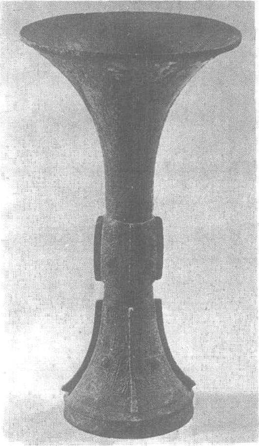 商。古代饮酒器。通高28.4厘米,口径15.8厘米,腹深18.1厘米。重1.2公斤。1953年陕西省岐山县礼村出土。陕西省博物馆藏。此觚口呈喇叭状,细腰微鼓,四条棱脊将器腹和圈足分成四等分。颈部饰蕉叶纹,腹部和圈足均是饕餮纹,圈足内铸有铭文三字,记氏为父乙作器。