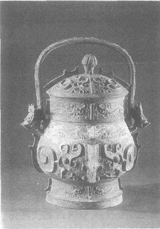 | 释义 | “”铜卣西周。通高36厘米,口径14.8——11.6厘米,腹深20厘米。重6.5公斤。1971年陕西省泾阳高家堡出土。陕西省博物馆藏。卣,古代酒器,用以盛酒。此卣体呈椭圆形,鼓腹。盖有瓜棱形钮,提梁两端作龙首形,盖顶及腹部为张口卷唇的巨首身尾卷曲夔龙。盖沿和圈足亦饰夔龙器口下饰双身共首夔纹。自盖至足,有四道扉棱。盖内铸有铭文“作父戊彝戈”四行七字,记载为父戊铸造祭器。器内底有“