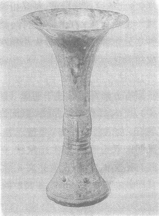 商。饮酒器。高24.4厘米,口径14.6厘米。台北故宫博物院藏。喇叭形口,长颈,细腰,圈足下侈。通体纹饰。蕉叶纹、饕餮纹剔刻精细。口内有图形铭文二字。