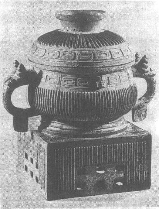 “”铜簋西周。通高35.7厘米,口径22.8厘米,腹深11.4厘米。重11公斤。1976年陕西省扶风县庄白村窖藏出土。陕西省周原文物管理所藏。此簋为矮体宽腹,下有方座。兽首屈舌形双耳,兽角呈螺状耸出器口。方座四面均有六个方形镂孔。通体除口沿和盖沿饰重环纹外,周壁全是直棱纹。器内底及盖内铸相同的铭文14字,内容是自述先祖父辈给周王室掌管威仪(礼客),兢兢业业。现在,周王又使自己继承先人职务,并赐了佩饰,铸此宝簋,以享祀神祗,祈求多福。铜簋共出土八件,其形制、纹饰、铭文完全相同,是同时铸造的一套祭器,当为西周懿、孝时期遗物。此器形制颇具特点,在西周中期是不多见的。