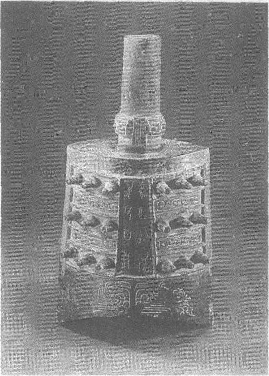 “”铜钟西周。通高38.5厘米,甬长14.6厘米,铣间21厘米,鼓间14.1厘米,舞修18.5厘米,舞广13厘米。重12.75公斤。1976年陕西省扶风庄白村出土。陕西周原扶风文管所藏。钟,古代乐器。此钟系甬钟。甬中空与体腔相通,鼓部饰相对顾首鸟纹,右侧有一立鸟。舞部和篆间饰云纹。钲间有铭文“作协钟万年日鼓”八字。此器为西周中期偏晚之物。