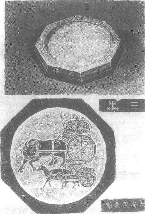 | 释义 | “三车”澄泥砚明。直径18.7厘米,高2.1厘米。天津市艺术博物馆藏。用山西绛县细泥烧制而成。质地坚硬细腻,色暗黄。砚呈八角菱形,正中圆形砚堂,四周回纹、饕餮纹边;背面镌刻“三车”图。“三车”即牛车、鹿车和羊车。据《法华经》曰:“盖菩萨乘(大乘)有普渡众生之愿,如牛车能乘载多人;缘觉乘(中乘)力极微,故譬之鹿车;声闻乘(小乘)三车无渡人之心,只欲自渡,故譬之羊车。”周一侧刻有仿金文“三车”二字,另一侧刻有楷书“六安周鼎制”款。由此知此砚出自名家高手。周鼎,明代六安人,字玉弦,工写真。