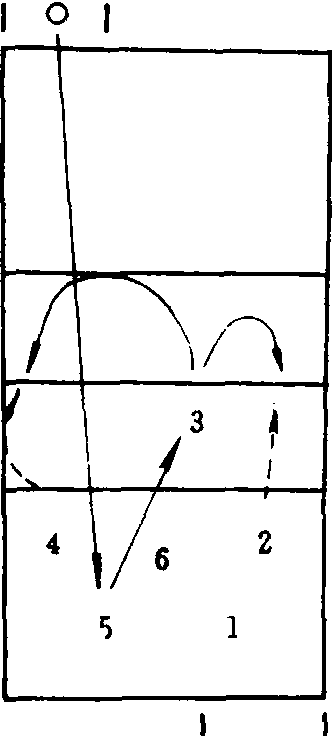❸教师从对方场区抛球过网,学生接发球组织该战术。 ❹教师在中场发球,进而在发球区发球,学生接发球组织“中1—2”进攻。 ❺为强化某个战术环节或解决某一问题,可有针对性地进行局部小配合练习。如解决二传与扣球间的配合,一传与二传间的配合等。 ❻组织教学比赛, 提高实战运用能力。 “中1—2”进攻战术由前排中间队员作二传,将球传给前排其他两名队员扣球的进攻战术形式。其特点是分工明确,较易组成。但变化较少,战术意图易被对方识破,是最简单、最基本的进攻战术形式,多为技术水平较低的队采用,也适宜于老年人。接发球采用“1—3—2”站位方法,其战术组成方法为:3号位队员接到一传后,组织2或4号位队员进行一般定点高球进攻。该战术通过二传与进攻队员间的配合可组成集中、拉开、平拉开、背传等变化形式;高水平运动队还可运用一点定位、一点跑动的活点进攻,也可两点跑动换位进攻。 |
