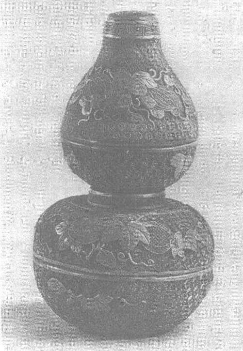 | 释义 | “乾隆年制”剔红瓜瓞纹葫芦式盒清。高20.5厘米,最大径13.7厘米。北京故宫博物院藏。葫芦形,上、下两层,子母口,可以分开。盒内黑漆地上饰描金花卉,盒外遍饰剔红锦纹,并在上、下盒盖上,雕刻连绵凸起的小瓜。盒体散缀几片舒卷自如的丰叶,底刻“乾隆年制”楷书款。此盒造型别致,纹饰优美,颇具雅趣。剔红见“剔红兽环钵”条目。