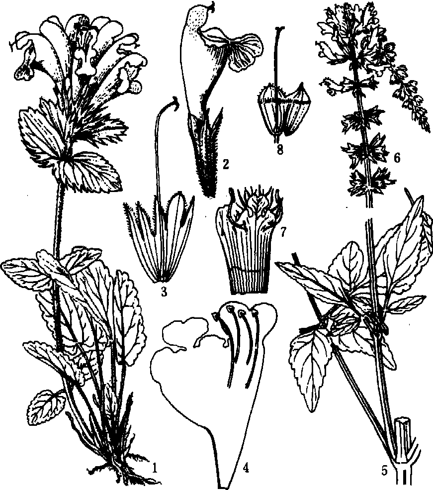 唇形科mint family; Labiatae双子叶植物。多为草本。本科有200多属,3 500种,广布全世界,主产于地中海及中亚。中国约有99属,808种。茎方形。单叶,对生。聚伞花序,常聚为轮状或再呈穗状、总状、圆锥状排列;花萼具5齿裂,有时呈二唇形,宿存;唇形花冠;2强雄蕊(2长2短),有时仅存2枚;雌蕊由2心皮构成上位子房,深裂而成4室,每室1胚珠,花柱基生,成熟时,形成4个小坚果。染色体x=b~11,13,17~20。唇形科中药用植物有:益母草、夏枯草、丹参、香薷、霍香、黄芩、白苏、紫苏、半枝莲、茜草等;重要的香料植物有:薄荷、百里香、迷迭香等;观赏植物有:罗勒、薰衣草、一串红等。此外,还有可制凉粉兼药用的凉粉草,是中国南方特有植物。 唇形科双子叶植物。一年生或多年生草本,灌木或亚灌木,常芳香。茎枝常四棱。叶对生,稀轮生或互生,单叶稀复叶。聚伞花序常组成轮伞花序,稀近辐射对称。果常为4枚小坚果。世界约220属,3500种,分布全世界,主产地中海地区和东南亚。中国97属,807种。主要属有香科科属、筋骨草属、黄芩属、薰衣草属、藿香属、荆芥属、青兰属、铃子香属、糙苏属、益母草属、假糙苏属、水苏属、鼠尾草属、风轮菜属、百里香属、薄荷属、地笋属、香薷属、香茶菜属、肾茶属等。唇形科不少种类是重要药用、芳香油、观赏、蜜源植物,许多种类引种作经济植物大量栽培,如一串红、薰衣草、薄荷等。 |