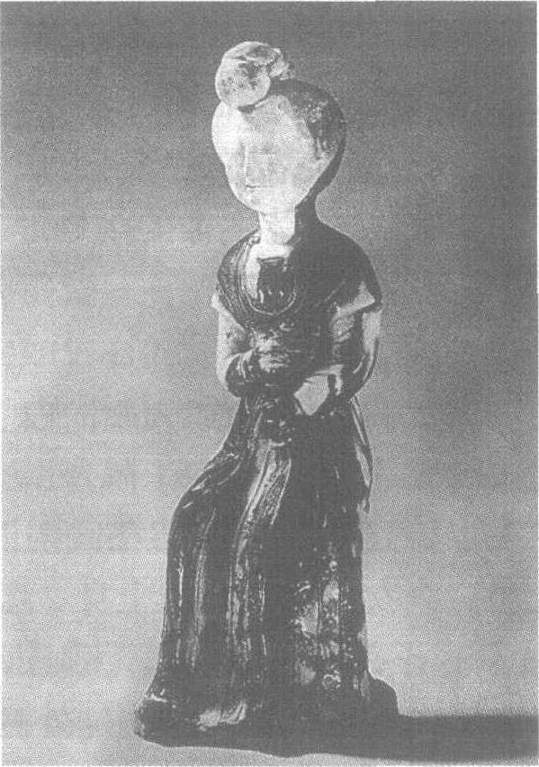 唐三彩女俑 唐三彩俑继承了秦汉以来雕塑艺术的优良传统,从广阔的角度反映了唐代社会生活。特别是人物俑的塑造突破了前代某些程式化的束缚,更加潇洒奔放,创造了不同阶级、阶层,不同民族、不同身份形形色色的人物形象: 有丰腴傲慢的贵妇; 有谦恭顺从的侍女; 有温和恬静的文吏; 有勇武暴躁的武士; 有欢快奔放的舞伎; 有豪爽乐观的胡人……而且千人千面,千姿百态,单以女俑来说,就有骑马的、骑驼的、抱婴的、逗鸟的、倦睡的、照镜的……好一个大千世界这件三彩女俑是1954年在西安出土的,高28. 5厘米这位衣着华丽、体态优美的少女,头梳单髻、额贴花黄,眼迷离、嘴微笑,半依半坐若有所思,充满了内心的喜悦。描绘人物外貌特征的同时并着意揭示人物的内心世界,是唐代人物俑的重大成就,对五代宋元陶俑有一定的影响。 |