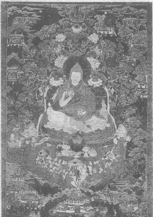 | 释义 | 唐卡五世达赖像清。布画,设色。纵98厘米,横64厘米。西藏自治区拉萨市布达拉宫藏。此幅唐卡描绘的是五世达赖讲经画像。五世达赖名阿旺罗桑嘉措(公元1617—1682年),生于山南穷结地方。明天启二年(公元1622年)时,他才六岁,被三大寺僧众迎入哲蚌寺供养。公元1625年拜四世班禅为师,受沙弥戒,1637年受比五戒。明崇祯十五年(公元1642年),推翻西藏地方统治者噶玛噶举派藏巴汉政权,建立了甘丹颇章地方政权。清顺治九年(公元1652年)进京朝觐,次年返藏途中被封为“西天大善自在佛所领天下释教普道瓦赤喇帕喇达赖喇嘛”,并赐以金册金印。从此达赖喇嘛的名号正式固定下来,它在西藏的地位由中央政府承认并确立。晚年从事著述,著有《相性新释》、《西藏王臣记》、《菩提道次第论讲义》、《引导大悲次第论》等三十余卷,清康熙二十一年(公元1682年)在布达拉宫圆寂,第斯桑结嘉措为其修建金塔安葬遗体。这幅唐卡描绘了身着法衣、脑后有光环的达赖五世,手执法器,正襟危坐,给弟子们讲经学的情景。达赖五世表情严肃,面呈沉思之态。下面洗耳恭听的是达赖的忠实信徒。他们双手合十,跪在达赖面前,十分虔诚。有二、三听众面有疑问,似与邻座探讨。在达赖左右,有二人手捧香炉站在一旁恭候;脚边有两只大象,呈半跪姿态,随时听令。其四周屡屡再现的风格各异、形式不一的寺院、宫殿之中,达赖五世拜师、受戒、传经讲学的画面,起到了点化、突出中心人物的作用。