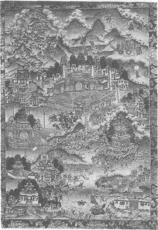 | 释义 | 唐卡松赞干布画传清。布画,设色。均长91厘米,宽62厘米。西藏自治区拉萨市布达拉宫藏。在藏族古代史上,具有雄才大略的松赞干布,是吐蕃王朝的缔建者。传说松赞干布是由于圣观之光的照射,致使松赞王后支洒退噶马怀胎所生的胜妙王子。出生之时,此王子头有阿弥陀佛相,手与足皆有轮相,发青蓝色。诸佛为之加持,诸菩萨为赞吉祥,诸天为之雨花,大地现六种震动。由于王子的出现,十方诸佛愿助一臂之力,使西藏这个边地黑暗之国,如燃明灯,变为宝洲。因此,松赞干布13岁就任王位后,进行了平定战乱,发展生产,创制文字,制订官制,建立吐蕃政权等一系列的工作,战果赫赫,威震八方。历史上松赞干布于公元641年与唐文成公主联姻,遣贵族子弟赴长安入国学,接受汉族先进生产技术,促进汉藏经济、文化的交流。公元649年被唐封为附马都尉西海郡王,对藏族社会经济的发展和汉藏友好关系的加强,作出了重要贡献。松赞干布的传记唐卡很多,这一套为三幅。第一幅主要描绘松赞干布派遣大臣禄东赞前往长安向唐请婚,迎娶文成公主进藏的故事。当时来自许多国家种族各异、肤色不同的请婚使者五百骑,一时齐集于唐王之前。西藏使臣以其卓越的才智战胜了各方对手,并在三百多个宫女中选中了文成公主。这幅唐卡的左上方详细地描绘了藏臣使者向唐太宗请婚的情景,右侧为选宫女的场面,中间部分表现文成公主携嫁妆及奴婢随藏臣进藏的情况。下部为修建大昭寺的景况,人们有的凿佛像,有的建宫殿,有的运水,有的积石,一派忙碌景象。整个画面人物众多,但每个人的动作及面部表情清晰可见。第二幅唐卡描绘了为松赞干布修陵墓的场面和芒松芒赞、梅阿充、都松芒波杰等赞普诞生的情景,以及都松芒波杰时期的七大力士。松赞干布死于公元650年,他的陵墓修在山南穷结地方,前临雅隆河,后靠本惹山。画面上方即为他修建的陵墓。画中可见僧侣们正在为松赞干布守灵。中间部分再现了几代赞普诞生的情景:芒松芒赞为松赞干布的孙子,因其父早亡而继承松赞干布为赞普;都松芒波杰是芒松芒赞的儿子;梅阿充,又叫赤德祖赞,娶唐金城公主为后。画面的右下方描绘了都松芒波杰在位期间,吐蕃的七位大力士各显神通的场面。唐卡内容繁多,布局精妙。第三幅主要描绘了松赞干布时期修建大昭寺、王妃蒙萨赤江生子贡日贡赞以及松赞干布逝世的情形。上部的大昭寺十分雄伟,以佛教为中心,四周为各式殿堂,以供奉各路佛、神。一条蜿蜒曲折的河流盘绕在寺庙的周围,使依山傍水的大昭寺更加壮观。中部表现了王妃生子的情景,生动逼真。下方描绘了松赞干布逝世的情景。松赞干布在位70年,声威大震,功绩卓著,天下宾服,使佛教法,如日上升,降欲乐受用之雨,使民安居乐处,享年八十有二。这组唐卡形象地介绍了松赞干布一生中的重大事件以及有关的情况。用笔细腻,构图讲究,色彩浓淡相宜;画中奇石山景,气势雄伟;人物刻画注意神韵;整个画面布局合理,视野广阔。