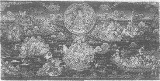 | 释义 | 唐卡罗汉渡水图清。布画,设色。纵95厘米,横220厘米。西藏自治区日喀则市扎什伦布寺藏。此幅唐卡描绘的是罗汉渡水的情景:一望无垠的大海上,天水相连。万倾碧波之中,罗汉们驾祥云纷纷而至。他们有的骑狮,有的乘龙,有的骑虎,有的乘龟,边嘻笑着边渡水而去。可谓罗汉过海,各显其能。那些凶猛的野兽们此时却低头拱身,服服贴贴地听从调遣。龙宫中的虾兵蟹将恭恭敬敬地列队迎送,喜怒无常的大海也变得宁静温顺,与正在行进着的和相继到来的罗汉们构成了整个画面。这幅唐卡,构思巧妙,趣味横生,笔墨细腻,视野广阔。罗汉们身着各色佛装与蔚蓝色的大海形成鲜明的对比,起到了互相烘托的作用。