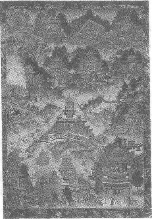 | 释义 | 唐卡金城公主进藏图清。布画,设色。纵91厘米,横62厘米。西藏自治区拉萨市布达拉宫藏。这幅唐卡描绘的是唐雍王宗礼之女金城公主进藏的情景。金城公主被唐中宗收为养女并封其许嫁吐蕃赞普。唐景龙三年(公元709年)吐蕃遣大臣为赞普请婚,景龙四年(公元710年)唐中宗以金城公主许之,并派杨矩送金城公主去吐蕃。金城公主原先是许给赤德祖赞的王子姜查拉温的。据说金城公主随身携带一面宝镜,先在镜中看到的是一英俊少年,但是到了路途忽然心惊,再视宝镜时,却显示出老态龙钟的老头,原来姜查拉温此时已坠马身亡。金城公主到了吐蕃只好同赤德祖赞完婚,住在桑耶附近的扎玛镇桑,“于江岩宫中”生下了吐蕃名王之一:赤松德赞。此图形象而生动地再现了吐蕃大臣请婚、唐中宗允婚、特命大使护送金城公主去吐蕃完婚、姜查拉温坠马身亡、金城公主中途凝视宝镜以及送亲队伍行进途中的历史画面。笔墨细腻,人物神态各异,形象栩栩如生。宫殿楼阁,金碧辉煌;马匹坐骑,姿态万千。