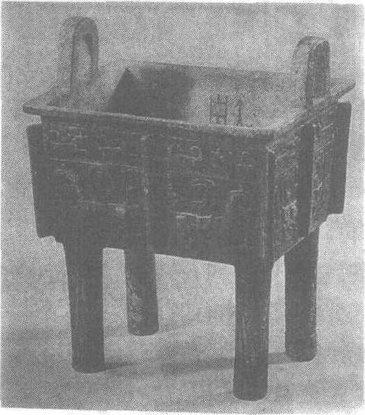 | 释义 | “交宁父乙”铜方鼎商。炊器,礼器。通高22.7厘米,口纵14.5厘米,口横18厘米,腹深10厘米。重3.42公斤。1953年陕西省岐山县礼村出土。北京中国历史博物馆藏。此鼎口沿平折,直腹,四柱足。腹部四隅及四面中间均起扉棱。口沿下饰夔纹,腹部饰饕餮纹,均以云雷纹填地。四足饰阴线蝉纹。鼎内壁铸有铭文:“交宁父乙”四字,为交宁氏给父乙作器。器造型庄重,纹饰美观。