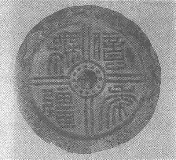 西汉。直径19厘米。陕西省咸阳市博物馆藏。属文字瓦当中的吉祥语类瓦当。瓦当中心为一圆,内作乳钉纹,外在双线十字形分割的四个扇面内,分别书以小篆“亿年无疆”四字。字体结构严谨、笔画刚健遒劲,体现了书家雄厚的功底,为研究汉代篆书提供了资料。瓦当见“‘羽阳千岁’瓦当”条目。