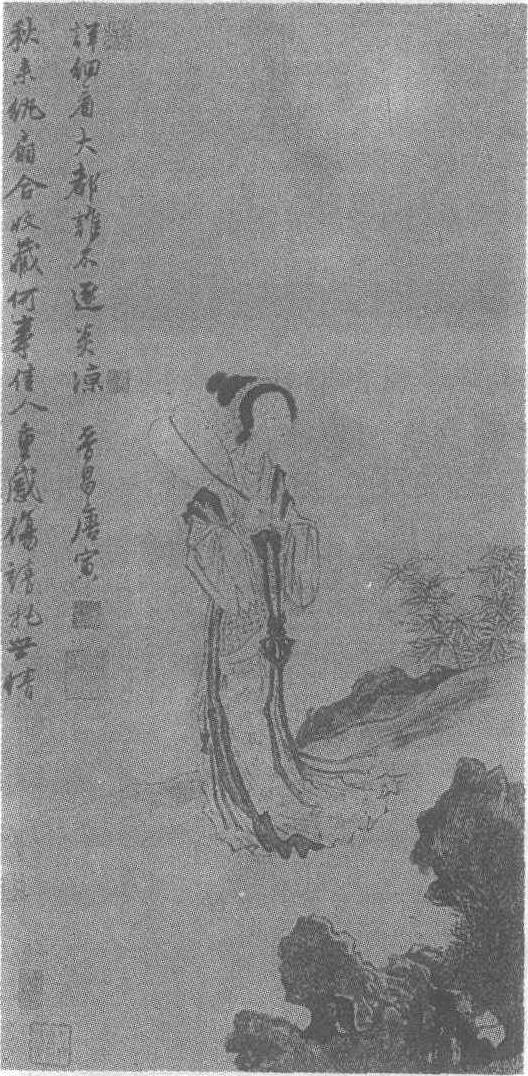 | 释义 | 唐寅秋风纨扇图轴明。唐寅(见《唐寅湖山一览图轴》条目)绘。纸本墨笔。纵77.1厘米,横39.3厘米。上海博物馆藏。此图画一仕女,手持纨扇伫立于庭院中,容貌秀丽,双眸凝视前方,一副若有所思的神态。高耸的发髻,青丝如墨。背景简括,画坡石一角和疏落的细竹。左上角题诗:“秋来纨扇合收藏,何事佳人重感伤,请把世情详细看,大都谁不逐炎凉。”诗画互相映衬,表现了仕女从一柄夏天始用,秋天收藏的小小纨扇,联想到自己也与这纨扇命运一样。青春难驻,世态炎凉,禁不住惆怅伤感。突出了“秋风见弃,触目伤情”的主题。此图充满了作者对弱小者的同情。全画用白描法,墨色浓淡适宜,笔墨流动奔放,挥洒自如,极富韵律感。衣纹转笔方劲,线描遒劲飞舞,衣服线条起伏很大,点出“秋风”之意。