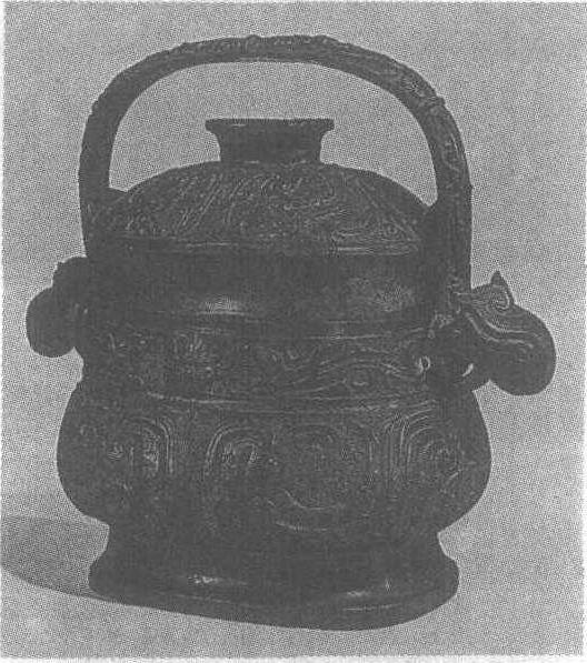 西周。盛酒器。通高20.6厘米,口径12.6厘米。台北故宫博物院藏。覆碗形盖,椭圆形身,垂腹,双环耳,耳上套嵌两端作兽首形的提梁,圈足。卣表饰蝉、凤鸟、兽头及云雷等多种纹饰,形象十分生动。在卣的腹内及盖内分别刻相同的四字铭文一行。