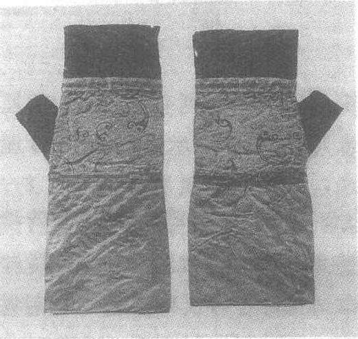 | 释义 | “信期绣”绢手套西汉。通长24.8厘米,上宽9.4厘米,下宽11厘米。1972年湖南省长沙市马王堆1号汉墓出土。湖南省博物馆藏。手套作直筒露指式,手掌面绢地为“信期绣”,正裁,缝在拇指上下,边缘镶饰“千金绦”两道;指部和腕部均用1/4幅绛色绢,斜裁,按螺旋方式缝合成筒状,再折为里、面两层,拇指部分另加布简并上侧有缝,腕部口无毛边。“信期绣”见“‘信期绣’褐色罗绮锦袍”条目。“千金绦”纹样由“千金”文字、雷纹、波折纹三种组成,分阴阳各异的两个单元纹饰,呈绛红色调,色彩古朴。