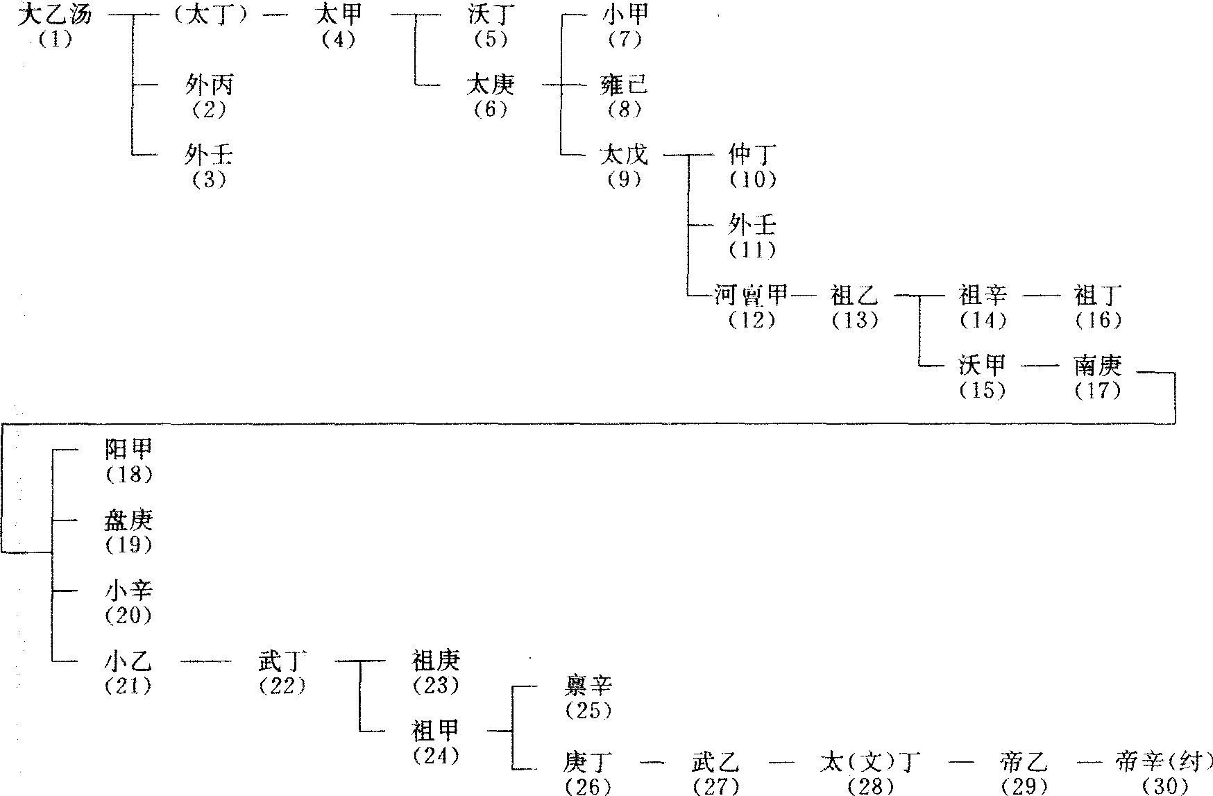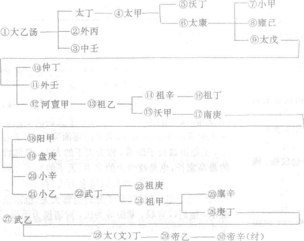 | 释义 | 030 商前16世纪—前11世纪大约在公元前16世纪,商部落首领汤灭掉夏朝建立的奴隶制国家。地处黄河下游,建都亳(今山东曹县南)。后来多次迁移,传到盘庚时,把都城从奄 (今山东曲阜) 迁到殷(今河南安阳小屯村)定居下来,历史上又称殷。农业发达,手工业能造酒,制造青铜器和白陶。共传17代,历31王,公元前11世纪,传到纣王时,被周武王灭掉。 商 世 系 表 一、汤以前商世系