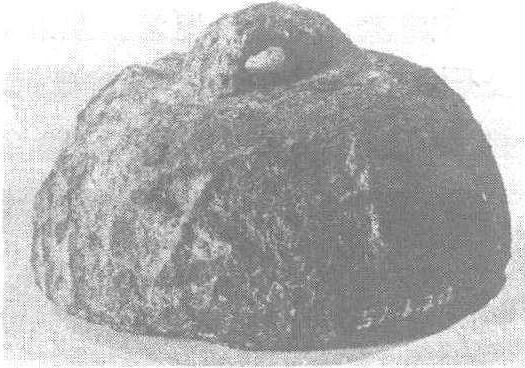 西汉。权,秤锤。通高7.7厘米,底径12.3厘米。测重3575克。北京中国历史博物馆藏。此权用铁制成,扁球形,上部有拱桥形鼻钮,腹部铸有凸起的阳文:“□州,十五斤。”按自铭折算,每斤合238.3克。