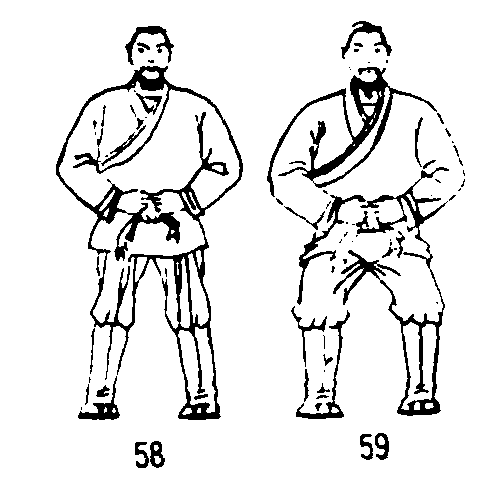 四十九式经络动功第1段“通经”动作之二:❶随着吸气,两腿徐缓伸直,两手不动。(图58)❷随着呼气,轻吐“咽”音,重心下沉,少商与商阳穴相捏互压,尽量将气呼出。(图59)练功次数:一吸一呼为1次,共做3次。要点:少商与商阳相捏互压时,大拇指用向内的滚捻劲进行;吐“咽”音时舌尖抵上齿内侧,音量要轻,耳不闻声;下蹲深度因人而异,但定要上体正直,松腰敛臀。经络动功第1段“通经”动作之九、第2段“循行”动作之十一以及第3段“导气”动作之十八都是重复此动作。