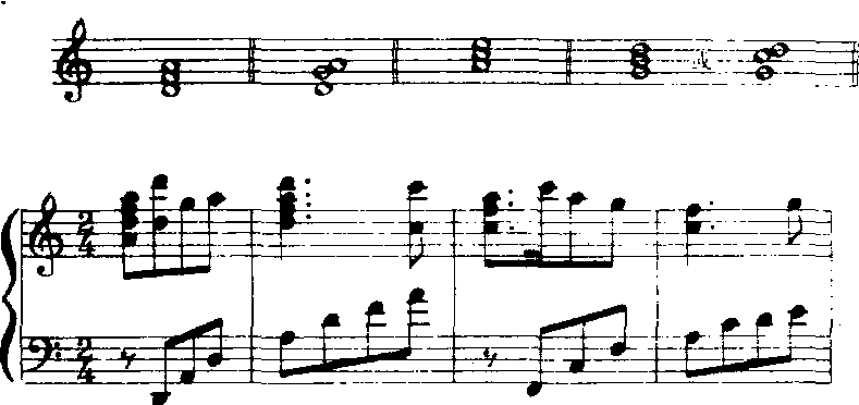 | 释义 | 商调式歌曲和声配置Shangdiaoshi gequ heshengpeizhi商调式的主音为商(re),其上、下五度骨干音分别为羽(La)和徵(Sol),在旋律中强调羽音则称为“羽商”调式,为小调性质,强调徵音则称为“徵商”调式,为大调性质。这两种商调式的主和弦应有所区别的应用,羽商调式可直接用以清角音(fa)为三音的原形和弦,徵商调式的主和弦则宜采用用徵音代替清角音作为三音的代用和弦。商调式的属和弦的三个构成音均为正音,下属和弦中含有偏音变宫音(si),但处于三音位置,已被淡化,不妨直接采用,也可用宫音代替变宫音作为三音,而构成代用和弦: