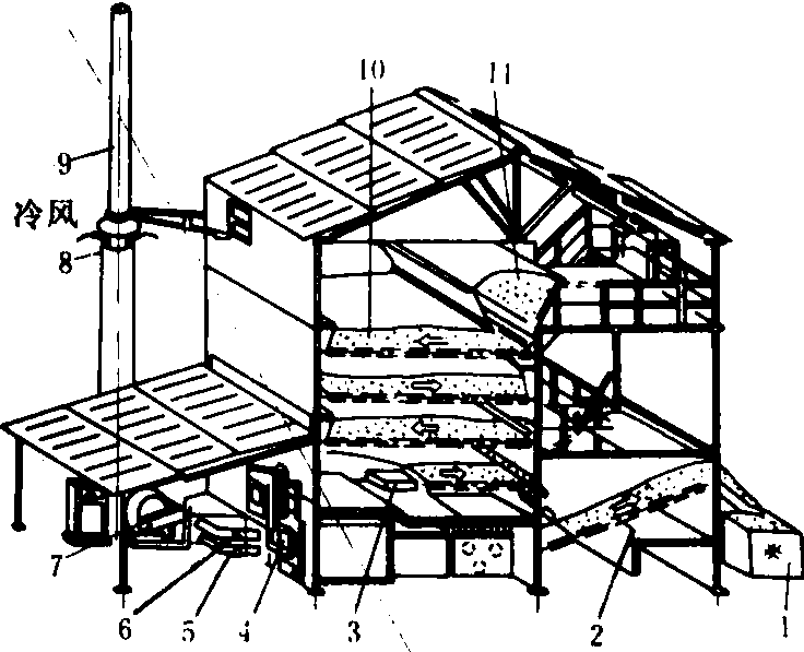 1. 出花斗; 2. 回潮室; 3. 均流风帽; 4. 燃煤热风装置; 5. 鼓风阀; 6. 冷风阀; 7. 鼓风机; 8. 吸风筒; 9. 烟囱; 10. 帘网式花床; 11. 鲜花斗