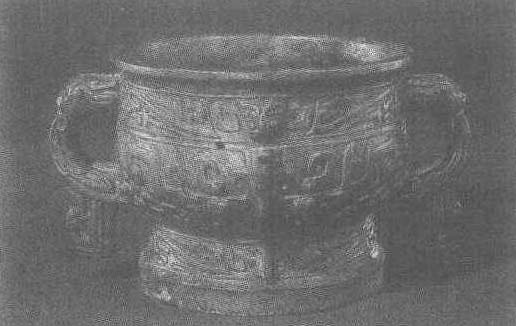 商。盛食器,礼器。高16.5厘米,口径21.6厘米。台北故宫博物院藏。圆形,侈口,鼓腹,兽首对耳有珥。颈饰夔纹,腹饰饕餮纹,圈足饰夔纹,颈有兽首,腹、圈足有棱。腹内有铭文“史”一字。商后期器。