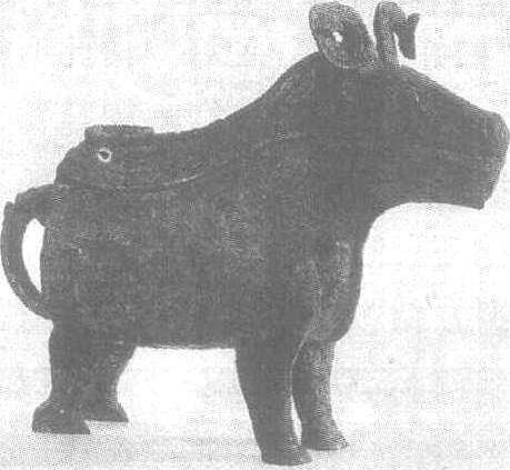 | 释义 | “后母辛”铜觥商。通高36.5厘米,通长47.4厘米。1976年河南省安阳市殷墟妇好墓出土。北京中国历史博物馆藏。觥也叫兕觥。《诗经·七月》:“朋酒是飨,称彼兕觥。”《诗经·卷耳》:“我姑酌彼兕觥。”都说明它是作成兕(野牛)形状的盛酒或饮酒器具。古人还常用“觥筹交错”这句话来形容饮酒的热闹场面。此觥由器、盖合为一体,作四足立兽形。首似马而有竖耳卷角,前足为奇蹄,后足则如鸟爪。体后有兽首鋬。流端有一圆孔,下为一通过胸部的扉棱。盖脊也作扉棱,成龙形,尾端卷曲。器、盖对铭“后母辛”三字。“辛”为妇好死后的庙号,“妇”为生名,“后”即㻈。“后母辛”铜觚,即武丁的子辈为祭祀亡母妇好所作的祭器。此觥花纹华美繁缛。盖脊龙纹两侧饰伏兽形纹,后端由一顾首长身夔纹环绕。器身前中部数处饰以夔纹,后半则作向后的鸟身形。形制、纹饰构想奇异,实属罕见。