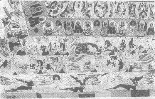 | 释义 | 善事太子入海品壁画北周。纵40厘米,横825厘米。甘肃省敦煌县莫高窟第296窟窟顶壁画。此图以连环画的形式绘制一幅长篇故事,讲的是国王勒那跋弥求子,结果第一夫人生善事太子,第二夫人生恶事太子。一次太子骑马出游,见到了穷人、病人,农夫耕地虫出,蛤蟆吃虫,蛇食蛤蟆;猎夫狩猎;屠夫宰畜;渔人捕鱼。所有这些杀生行为,均引起善生太子的感叹,遂以财物布施穷困。国库将尽时,善事入海求摩尼宝珠,与之同行的恶事在善事求到宝珠后刺瞎其双目,抢走珠宝,善事得牛王和牧人解救后流落异国,后与此国的公主结婚,辗转返回故乡。此图所绘的内容至善事与公主结为夫妇为止,画面紧凑,排列有序。图中所绘人物笔调简练,其动作和行为点到为止。一组组宫殿建筑巍然屹立,描绘得较为精细。图中的马匹十分生动,线条圆润有力。一些马匹和宫殿的屋顶还采用了中原内地的晕染法,增强了立体感。全图在淡色的背景上设色淡雅,而黑色的运用又增添了醒目感。
