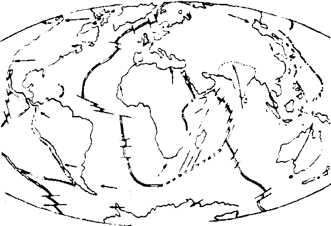 新生代海陆分布图 (据Dietz和Holden,1970,简化) 图中双线为海岭或中脊,直线为转换断层,短线虚线为俯冲带或海沟,箭头表示板块运动方向 喜马拉雅运动为喜马拉雅期的地壳运动(在地层上为古近系和新近系),共分3幕:喜马拉雅运动(1),同位素年龄为32Ma;喜马拉雅运动(2),同位素年龄为23.3Ma;喜马拉雅运动(3),同位素年龄为2.60Ma。 |