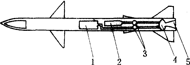 | 释义 | 喷气发动机penqi fadongji需要携带氧化剂的一种喷气式内燃动力机。图1是装置在火箭内的喷气发动机示意图,内部装有氧化剂(例如液态氧)1和燃料(例如液态氢)2,由输送泵3送入燃烧室4,在燃烧室内进行迅速的爆炸性的燃烧,生成高温高压的气体,燃料燃烧释放的热量变为气体的内能。经喷管气体的内能又转变为动能使气流以高速由喷嘴5喷出。根据动量守恒定律,气流向后喷出,火箭获得向前的动量,发动机不断地向后喷射气流,火箭被连续加速。喷气发动机自身携带氧化剂,因此可以在没有空气的空间使用,是唯一适合于宇宙航行的发动机。