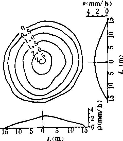 喷灌均匀度还可用喷水量分布图表示,即喷灌范围内喷灌强度等值线图和此图的平行与垂直风向的纵剖面图(图)。