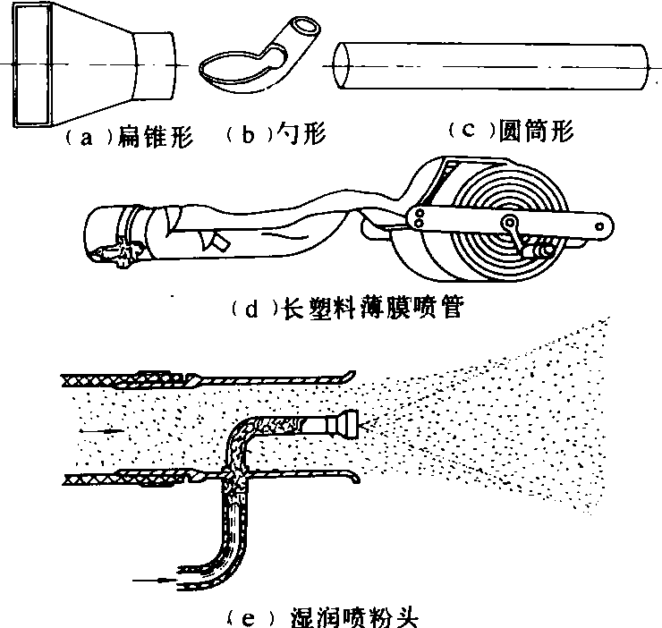 | 释义 | 喷粉头dust nozzle将携带粉剂的气流导向目标物的装置。是各种喷粉机具上的重要工作部件。它可分为扁锥形、勺形、扇形、直管形、文管形、长塑料薄膜管等形式(图1)。