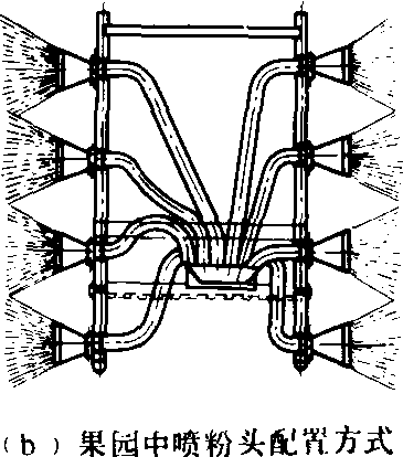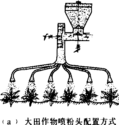 图1 喷粉头 扁锥形、勺形、直管形、文管形、扇形等喷粉头多用于手摇喷粉器,它们的粉流宽而短,喷撒面较宽,适用于农田作物。勺形喷粉头喷出的粉剂成为宽而短的粉雾体,并向上成一角度,适用于由下向上的喷粉作业,如棉田喷粉可将粉剂喷到叶子的背面。扇形喷粉头具有更宽的喷幅,直管形与文管形喷粉头喷射较远。 圆筒形喷粉头、长塑料薄膜喷粉管主要用在背负机动喷雾喷粉机。圆筒形喷粉头是一种远程喷头,粉流窄长,粉剂浓度均匀,用于动力喷粉机上水平射程可达20~40米,高射时射高10~20米,适用于果园、森林。长塑料薄膜喷粉管长约25~30米,管径约100毫米。在管的下面开有小孔,常取孔径6毫米,孔距为240毫米。管内装有与管长相等的细尼龙绳加强薄膜管的强度,这种喷粉管能有效地利用风机的风量,减少粉剂的飘移损失。在进行作业时,一人背着机动喷粉机,一人拿着喷管,分别沿着地块两头田埂前进,人和机都不进入田中,可以提高作业效率,减少对作物的损害。 当喷粉作业受外界风力影响较大,药粉易被吹散,不易粘附在植株上时,采用湿润喷粉头进行湿润喷粉,可提高粉剂的粘附性,减少喷粉量。即用加压雾化的水湿润药粉,由喷雾和喷粉两部分工作部件构成(见喷雾喷粉机),当扁锥形喷粉头、圆筒形喷粉头和湿润喷粉头用在大型机动喷粉机上时,应根据不同的喷射对象进行选择配置(图2)。对苗期矮小作物采用扁锥形喷头等距离安装在上方,向下对行喷撒。在果园中进行侧向喷粉作业,采用扁锥形喷头。在稻田进行喷粉作业时采用圆筒形喷粉头,射程比较远,机器可以不下田,只要沿着田块两侧的道路往返一次,就能防治宽约100米的田块。