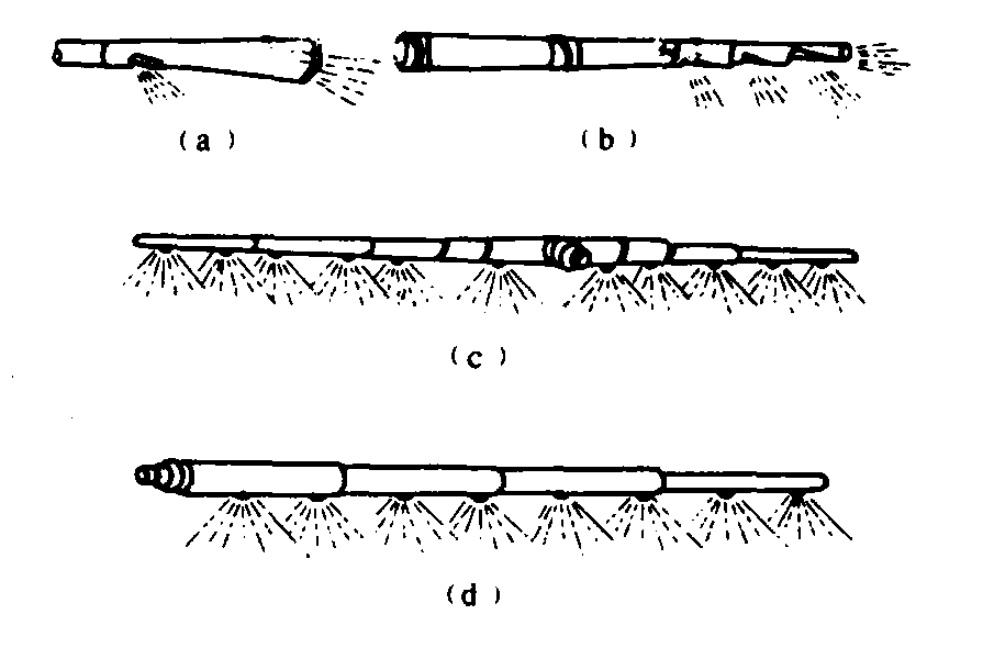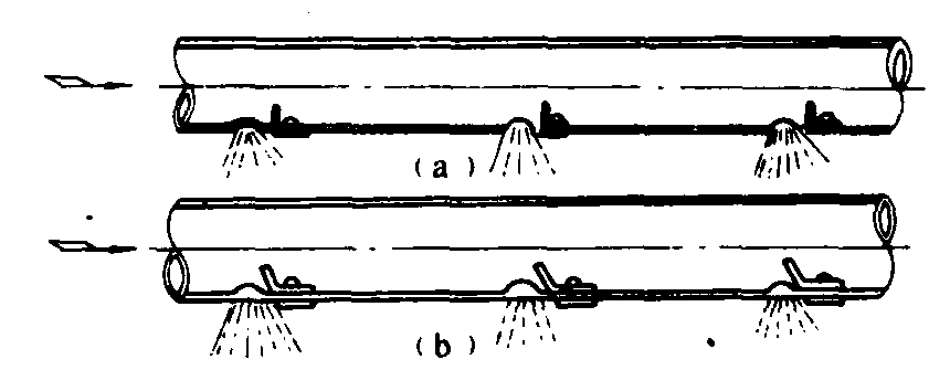 图1 喷粒头 喷粒管也有多种形状,如图2。使用时装在风机出风口的弯管上,可针对作物下部喷撒粒剂或肥料。图2(a)为用于稻田的喷粒管,可自田埂向两侧喷撒粒剂或肥料;(b)为田边作业式多孔喷粒管,射程可达10~18米,效率比前者提高;(c)为T型水平喷粒管,由8节短管组成,总长7米;(d)为I型水平喷粒管,由4节短管组成,总长3.5米。 日本于20世纪60年代开始在喷雾喷粉机上应用长塑料多孔薄膜管(图3)喷粉,于70年代将其发展用于喷撒粒剂的施粒机。一人背负机具,一人在另一端拉住薄膜管并上下抖动。边喷撒,边前进。管子上每隔30~50厘米有一10毫米左右的小孔,孔内一侧装有迎风舌,使粒剂分流向外喷出,并提高其撒布的均匀性。图3(a)为冲击式迎风舌,主要用于喷撒颗粒药剂;(b)为引导式迎风舌,主要用于喷撒颗粒肥料。使用时要按照所用粒剂的粒径及比重大小选择适用的喷管。喷雾喷粉机配用的长塑料薄膜喷粒管长20~60米,每亩喷撒粒剂2~3千克,所需时间为2~7分钟。这种长喷管还可配装在手推车式或拖拉机配套的喷粉机上使用。