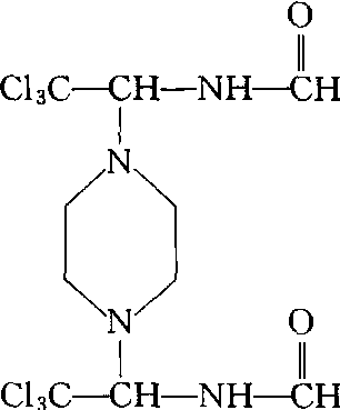 | 释义 | 嗪氨灵triforine又称嗪胺灵。杂环类杀菌剂。化学名称:1,4-二-(2,2,2-三氯-1-甲酰胺基乙基)哌嗪。化学结构式如下。原药白色无味结晶,几乎不溶于水、碱和酸中。在氯仿、芳香烃中溶解度很小,稍溶于甲醇和酮类。在二甲基甲酰胺和N-甲基吡咯烷酮的溶解度为30%和40%。内吸性杀菌剂,用于防治由白粉菌、锈菌、黑星菌等引起的禾谷类锈病和苹果黑星病,禾谷类、苹果、葫芦科白粉病等病害。以根部浇灌比叶面喷洒效果好,亦用于禾谷类作物拌种处理。它对菌的作用是抑制甾醇的生物合成,干扰膜的生成。在植株体内它损害白粉菌吸器,而不影响孢子萌芽。对植物安全,对人畜低毒,小鼠急性口服LD50>6 000 mg/kg,把鱼放入50 mg/kg溶液中,无中毒表现,对蜜蜂也无毒性。