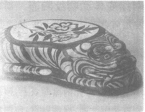 | 释义 | “大定二年”黄釉黑花卧虎瓷枕金。高9.4厘米,长32厘米。山西省博物馆藏。此枕的形状为一卧虎形,因为实用,虎背做成一平面当作枕面。制作时先施一层化妆土,而后在所需处涂以彩绘。作者以黑、黄彩绘出有凶猛之态的虎头,又以这两种色彩粗细不同的线条表示出美丽的虎斑,充分体现了作者高超的艺术表现力。枕面上有墨笔绘制的花叶一枝,具有清俊飘逸的情调。枕底部有墨书款“大定二年”。另在山西省的瓷窑中还发现过这种虎枕的残片。虎枕见“‘大定二年’白地黑花瓷虎枕”条目。
