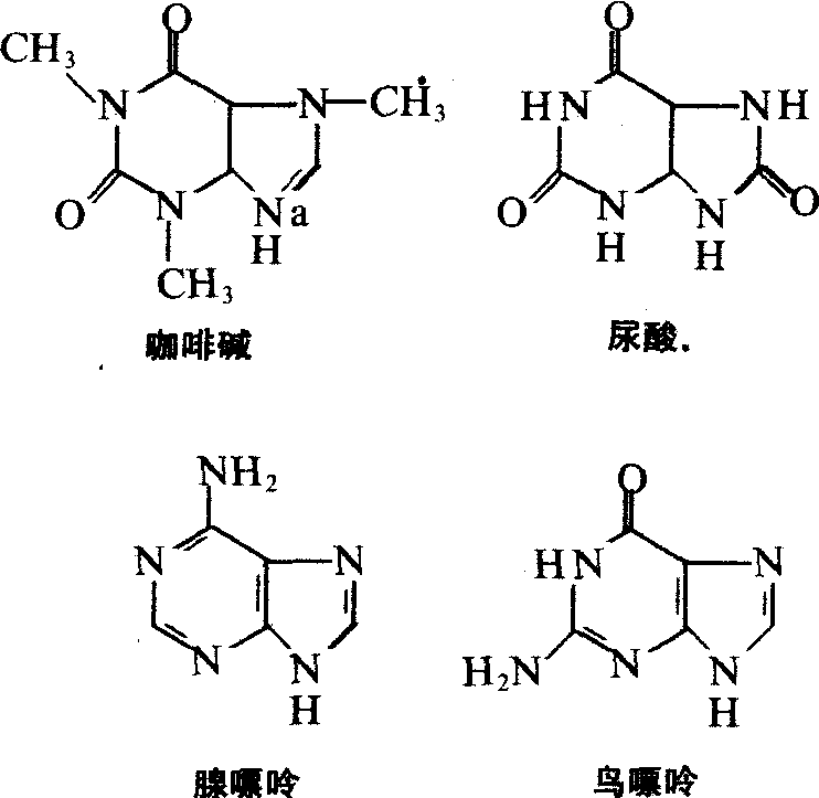 无色晶体,熔点为216℃,易溶于水,有弱碱性。嘌呤的衍生物广泛存在于自然界,如: