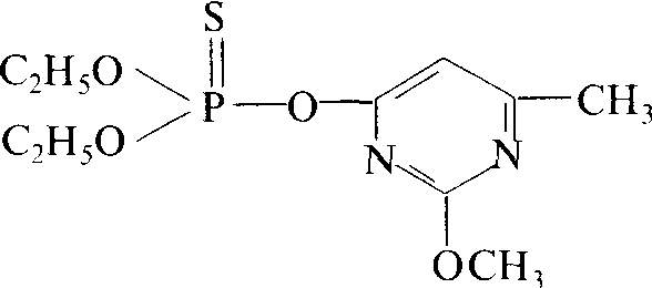 | 释义 | 嘧啶氧磷广谱性油状硫逐式一硫代磷酸酯类杀虫杀螨剂。化学结构式: