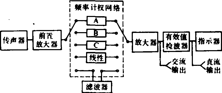 声级计结构原理 基本原理如图所示。由传声器、电压放大器(或衰减器)、滤波器(或计权网络)、记录指示器等组成。传声器主要任务是把声信号变成电信号。工作时要求它具有动态范围宽,频率响应平直,灵敏度高,稳定性好,电噪声低以及无明显的方向性等特点。通常采用电容式传声器。放大器是一般的电压放大器,它有一衰减器,既可测量微弱噪声,也可测量较强的噪声。滤波器是由电阻与电容组成的网络。由于声源不同,其声谱种类有连续谱、线性谱、复合谱等,根据测量要求选用不同的滤波器(或计权网络)。声级计一般不内附滤波器,但可外接1/3倍频程或各种倍频程滤波器,以构成灵活的分析系统。记录指示器通常用表头指示,表头读数一般有平均值、峰值、有效值(均方根值)三种,其中有效值使用最广泛。为此,内部附有检波电路。一般指示器的读数无法保存或进一步作数据处理,需要时可采用记录信号包络线的电平记录仪,它具有将交流声信号作对数、整流、平均后记录在纸带上的功能,便于与FFT联机作实时处理。并有由数字显示逐渐代替表头指示的趋势,给数据处理带来方便。