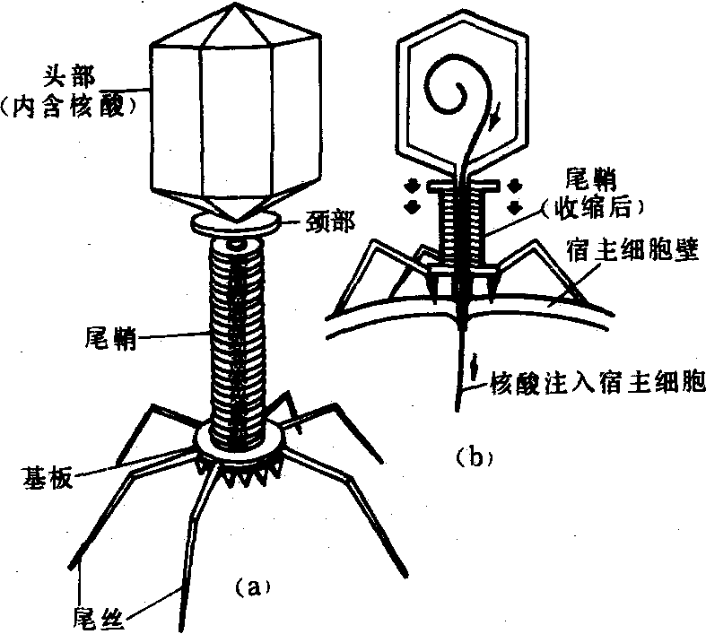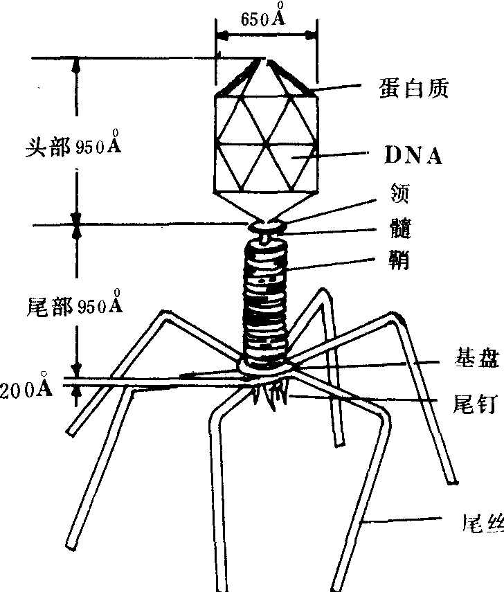 图571 T4噬菌体的结构 噬菌体bacteriophage一类感染微生物的病毒。它们中极大多数感染细菌,少数感染放线菌等其他原核微生物。感染的结果导致菌体破坏(溶菌),使菌落和菌苔产生噬斑。噬菌体有各种形态,极大多数呈二十面立体对称,少数呈长丝或近似球状。大肠杆菌T2噬菌体是这类病毒形态的代表,它除了二十面体的头部外,并有能收缩的尾部,尾端有基板、尾丝和尾钉(见图)。其他噬菌体的尾部不一定能收缩,甚至没有尾部。噬菌体的外部是蛋白质衣壳,内部为核酸,少数在衣壳外还有囊膜或其他成分。衣壳的功能是保护核酸和使噬菌体吸附于菌体表面。核酸是噬菌体的遗传物质,多数为双股DNA,少数为单股,还有少数为单股或双股RNA。