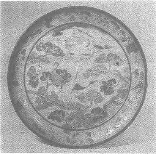 | 释义 | “大明嘉靖年制”斑地松鹤纹雕填漆盘明。高4.4厘米,口径31.4厘米。北京故宫博物院藏。圆形,矮圈足。盘内外髹米黄色漆地。盘内米黄色斑纹上,用浅绿、深绿、红、紫、黑、灰、杏黄等色绘松鹤云图:缭绕的祥云间,一仙鹤正飘然下落,其下疏落的松间,一虬干上,站立着褐、红、黑色三只鹤。红鹤引吭高鸣,迎接来客,褐、黑两只悠然自得地衔羽观望。盘壁回旋曲折的松枝间,四只仙鹤展翅翱翔着。圈足刻“大明嘉靖年制”款,已磨损只留残痕。此盘构图优美,色泽华丽,颇耐观赏。雕填见“‘大清康熙年制’雕填漆花卉纹几”条目。