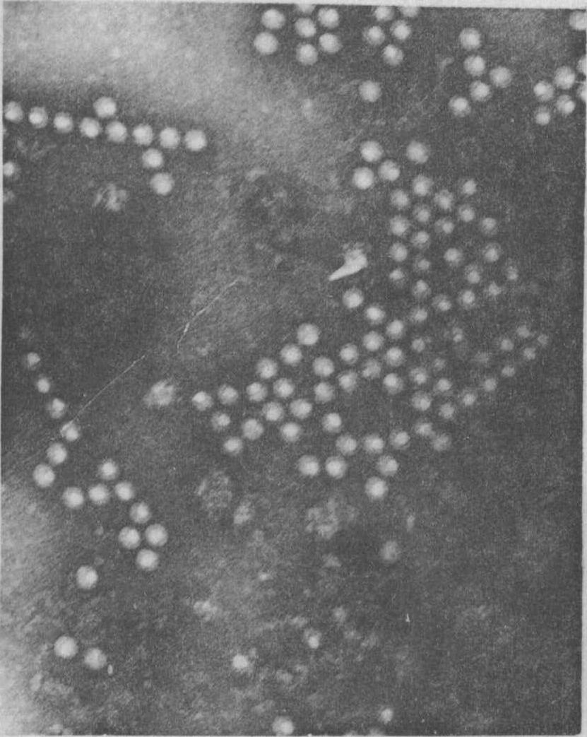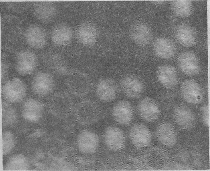 图1 意大利蜂囊状幼虫病毒(×1×106) 病毒在病死幼虫体内室温下能存活1个月,在一20℃冷冻下存活1年。在59℃热水中只生存10分钟,在甘油和蜂蜜中温度超过70℃才能被杀死,在18℃下贮藏10个月才丧失感染力;在腐败状态下,病毒只存活7~10天;病毒在蜜里存活30天,在王浆中存活21天。在阳光直接照射下,经4~7小时可杀死晒干的病毒。