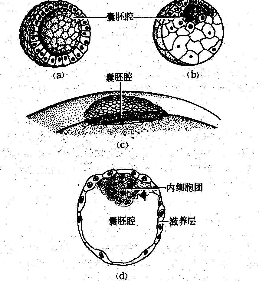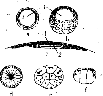 囊胚 a.棘皮动物的腔囊胚 b.两栖类的腔囊胚 c.鸟类的盘状囊胚 d.水母类的实心囊胚 e.水螅类的实心囊胚 f.腹足类的实心囊胚 1.囊胚腔 2.胚盘下腔 |