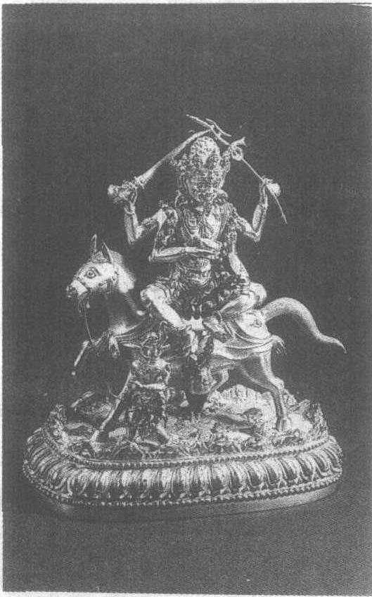| 释义 | “大明永乐年”吉祥天母鎏金铜像明。通高21厘米。西藏自治区拉萨市罗布林卡藏。据说吉祥天母是观音菩萨的化身,西藏密宗佛教对其极为信仰,人们在发誓时常以她来赌咒。此吉祥天母游戏坐于驴背之上,横眉怒目,相貌狰狞。有四臂,其中两臂高举刀戟,一手将头器捧至胸前,骷髅串挂在身上。璎珞、臂钏、手镯、脚镯佩戴齐全,皆华丽。坐下所骑毛驴臀部长一眼,正拉开四蹄,跋涉于山水之间。一象首人身者手牵毛驴,头上仰,似与吉祥天母呼应。莲座平台上所铸山水自然逼真。莲座近边缘处有“大明永乐年施”款,是这座佛教造像断代的标准物。