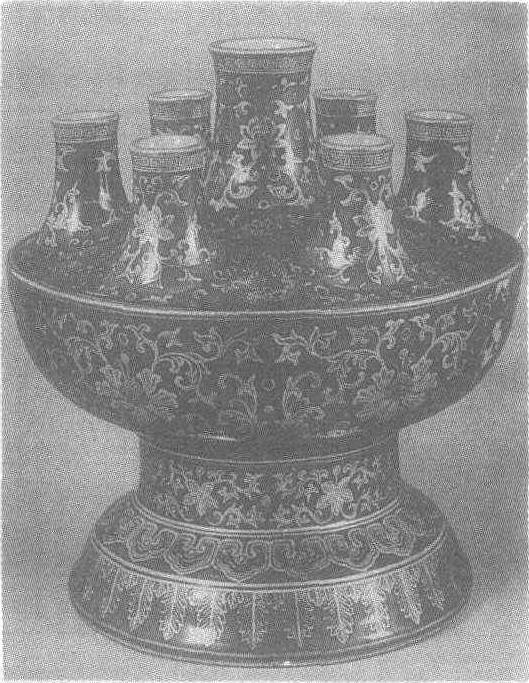 | 释义 | “大清乾隆年制”蓝釉描金花卉七孔瓷花插清。高25.3厘米,口径5厘米。台北故宫博物院藏。此蓝釉品种俗称霁蓝,霁蓝又名祭蓝、积蓝,属高温石灰碱釉,其特点为色泽深沉,色调浓淡均匀,除单色釉外,往往用金彩装饰。此器呈青铜豆形,面有管状七孔,腹部扁圆,高圈足呈座形。器表施霁蓝釉,器腹和七个插孔以金彩绘缠枝花卉,孔口饰一周回纹。器足有金彩缠枝纹、云头纹、蕉叶纹各一周,全器装饰富丽堂皇,底有“大清乾隆年制”篆书款。