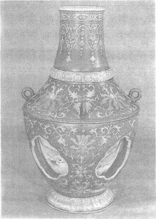 | 释义 | “大清乾隆年制”霁青描金镂空转心游鱼纹瓷瓶清。高23.4厘米,口径5.2厘米。台北故宫博物院藏。乾隆时期,瓷器品种不仅多样,且形制也千变万化。此瓶是在明代创烧的镂空套瓶基础上进一步发展而制作成功的。两瓶相套,内层可转动。外瓶撇口,折肩,敛腹,肩部饰四只环形耳。施霁青釉,并以缠枝蕃莲和蕉叶纹等描金图案装饰。腹部做四个镂空开光,从开光内望,可见内层瓶腹施绿釉,釉色青翠,上绘游鱼,水藻。当内瓶转动时,外瓶开光处可见鱼儿似在水中游动,形象极其生动。底有篆书“大清乾隆年制”款。