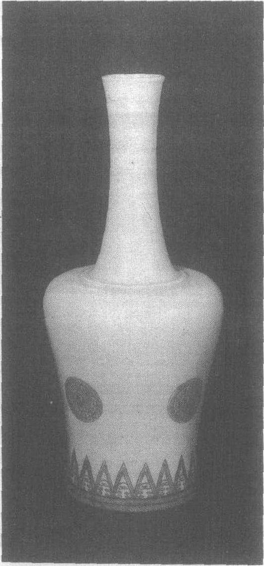 | 释义 | “大清康熙年制”釉里红镜纹瓷瓶清。高23厘米,口径3.2厘米。天津市艺术博物馆藏。釉里红是以铜红料为着色剂,在瓷胎上彩绘,罩一层透明釉后在120℃左右的还原气氛中一次烧成。这种工艺始于元末,至明宣德时期已出现一些成功之作,但以后又一度衰退。清康熙时期这一传统品种得到发展,取得了仅次于青花的卓越成就。此瓶口微撇,颈细长,平肩,腹部微向下收。通体施白釉,晶莹润泽。腹中部以铜红料绘古镜图案四个。近底处绘大锯齿纹一周,锯齿纹内有云纹。釉里红呈粉紫色,将素净淡雅的瓷瓶装点出几分妖媚。图案细笔描绘,线条清晰,如同刻画一般,底部有“大清康熙年制”青花款。